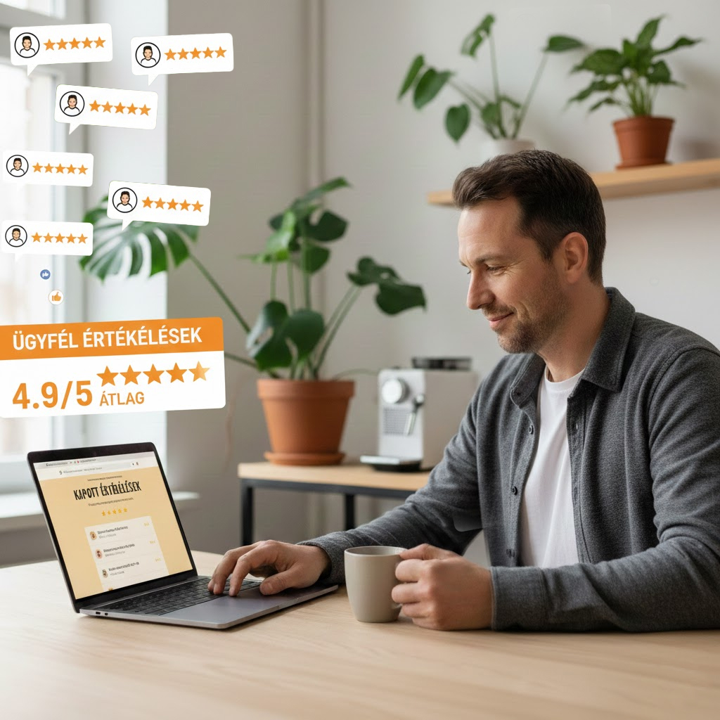 Kapsz egy profin felépített véleménygyűjtő oldalt (pl. ertekellek.hu/cegnev), ahol a saját logód és márkád fogadja az ügyfeleket egy szuperhatékony űrlappal.